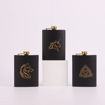 Toptan siyah kaplı 8oz paslanmaz çelik siyah cep şişesi Tumbler özel altın Logo viski şişesi likör alkol Aqua Flask